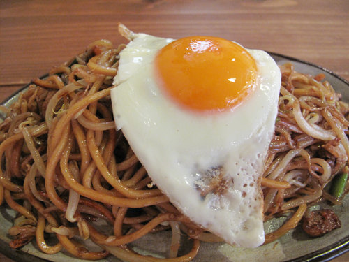 焼きそばの味が濃いので、生玉子のほうが緩和してくれそうです。