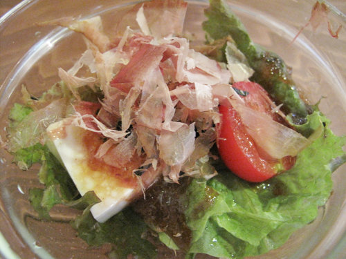 豆腐とミニトマト、それにかつお節と海苔、和風おろしドレッシング。