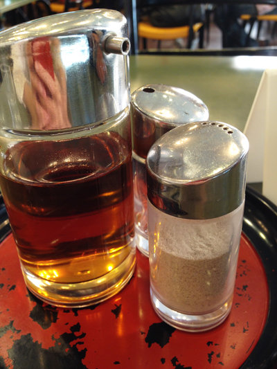 卓上には江山楼オリジナルの甘酢・ソー酢とコショウ。