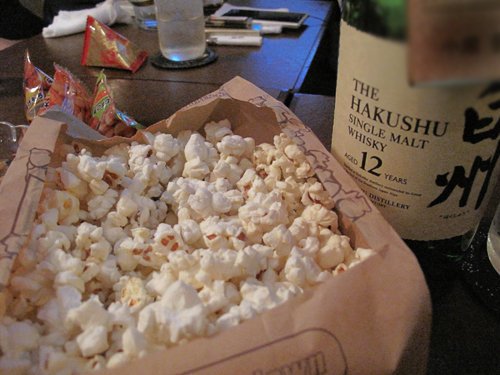 お通しに豆が出て、更にポップコーンが出てきました。