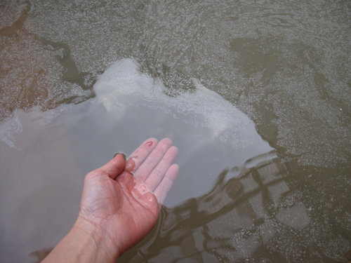 膜を張った豚骨スープみたいな、表面の白っぽい層は湯の花です。