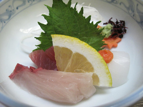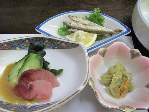 鯉の洗い・長湯温泉名物のわかさぎの塩焼き・芋がらの酢の物