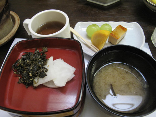 ご飯・香の物・しじみの味噌汁・フルーツとケーキ。