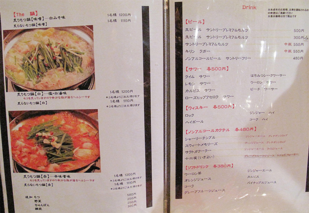 もつ鍋・ドリンクの一部のメニュー。