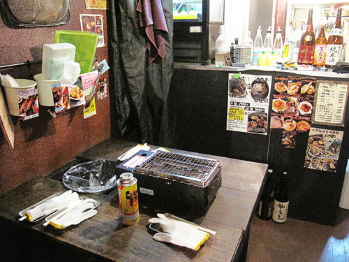 木のテーブルの上にはガスコンロ・軍手・オイスターナイフと牡蠣小屋仕様です。