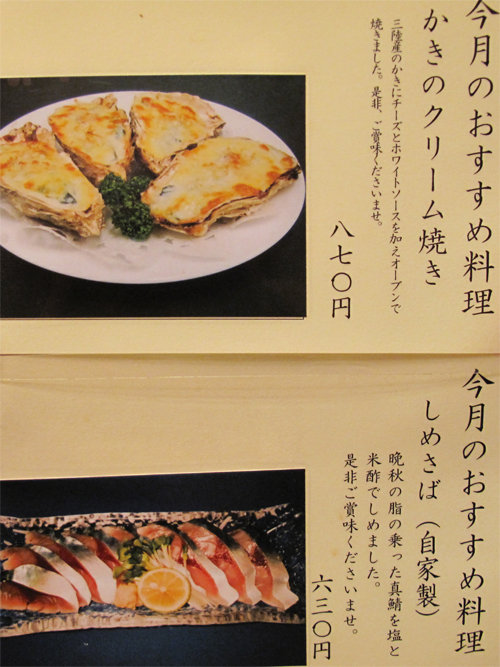 冬季限定のおすすめメニューは牡蠣のクリーム焼きとしめさばでした。