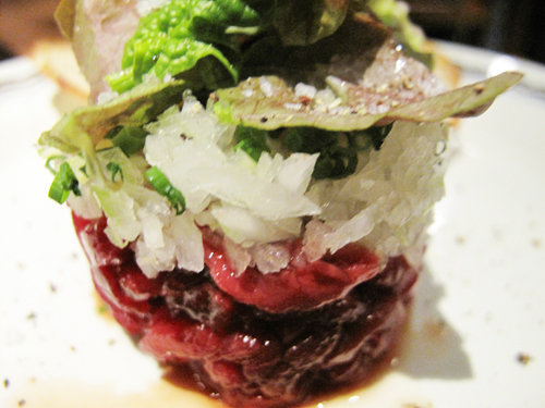 生の馬刺し・玉ねぎ・うずらの生卵・野菜を層状にまとめたものです。