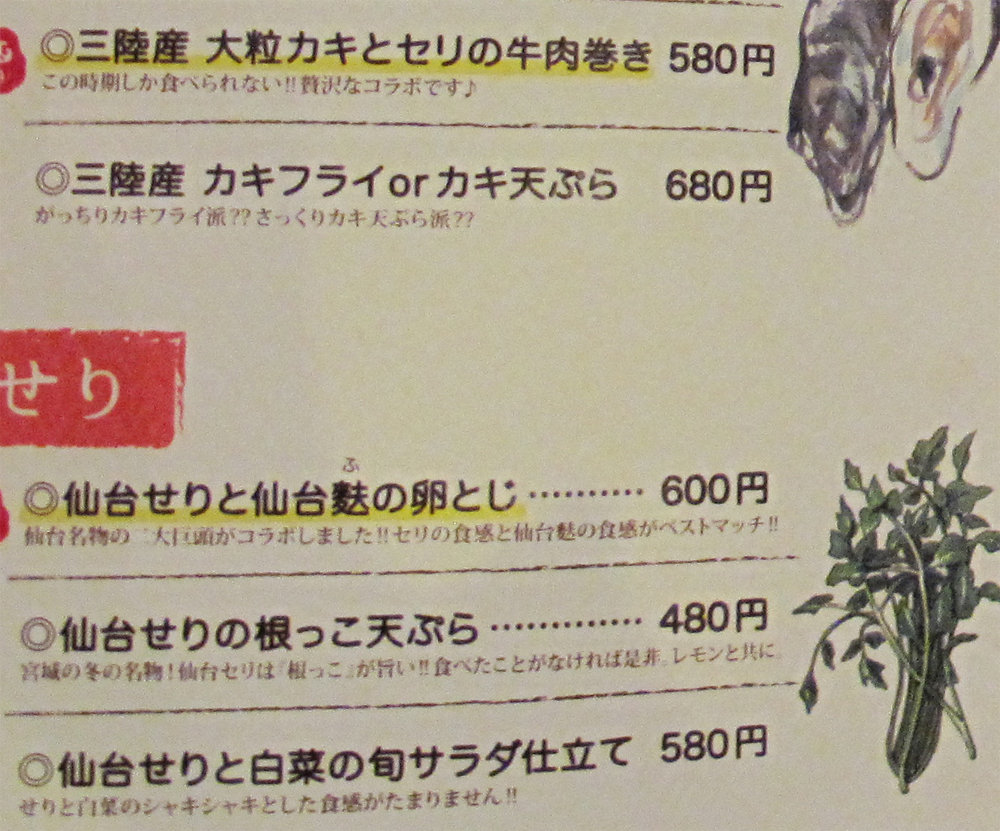 冬の時期は、三陸産の牡蠣と仙台せりのメニューがあります。