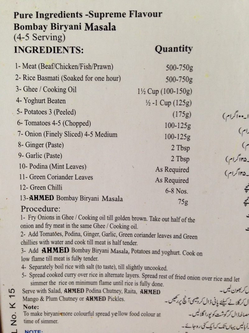 ビリヤニマサラスパイスの箱裏に書いてあったレシピ。
