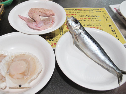 帆立はありがちですが、大目刺し(いわし)や鶏手羽先は珍しいですね。
