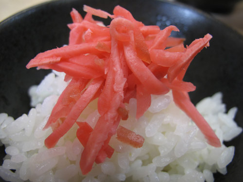 白ご飯を同僚にあげたら、誰かさんの真似して紅ショウガオンザライスにしてました(笑)。