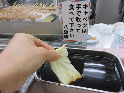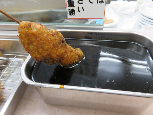 串かつ屋でお馴染みのフレーズ『ソースの二度漬けは禁止!』。