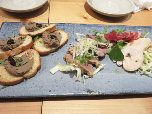白肝のレバーペースト・鴨のグリル・豚の首肉を使った生ハムのコッパ・鶏ムネの自家製ハムです。