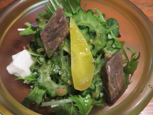 水菜が主体ですが、トッピングにゴーヤーの薄切り・沖縄の黄色い人参・海藻の寒天?・ジーマーミー豆腐。