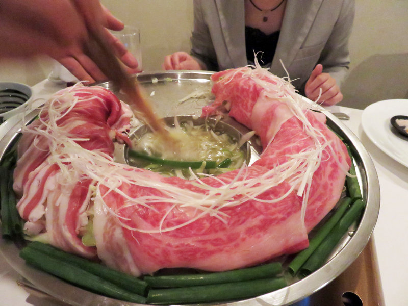 特許を取ったドーナツ型の鍋に美しく盛られたお肉と野菜を、濃厚な牛テールスープでしゃぶしゃぶのようにして頂くもの。