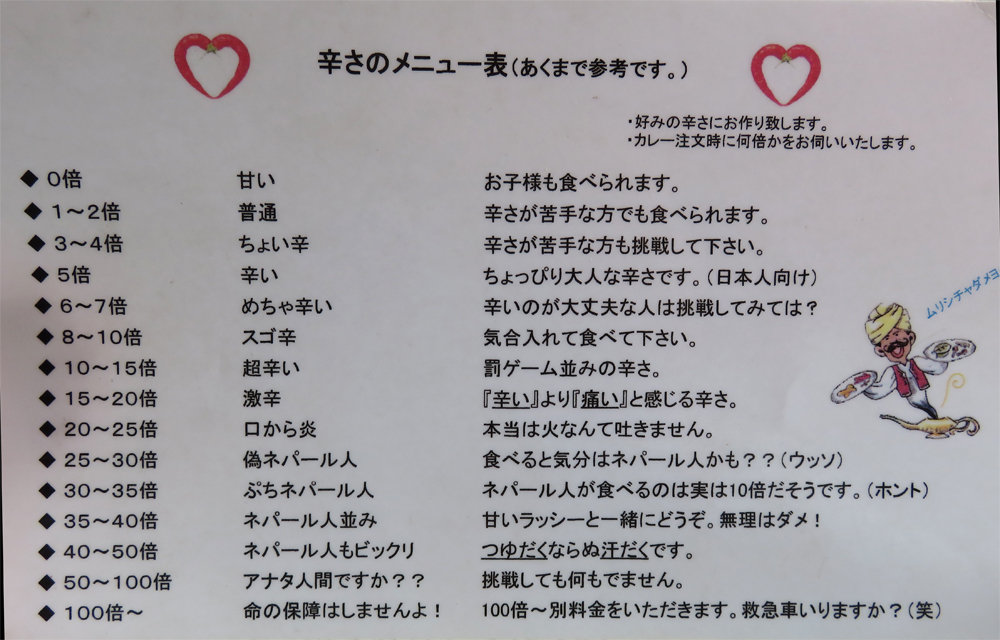 辛さは0倍〜100倍まで選べるのですが、この辛さの表現が面白いのです。
