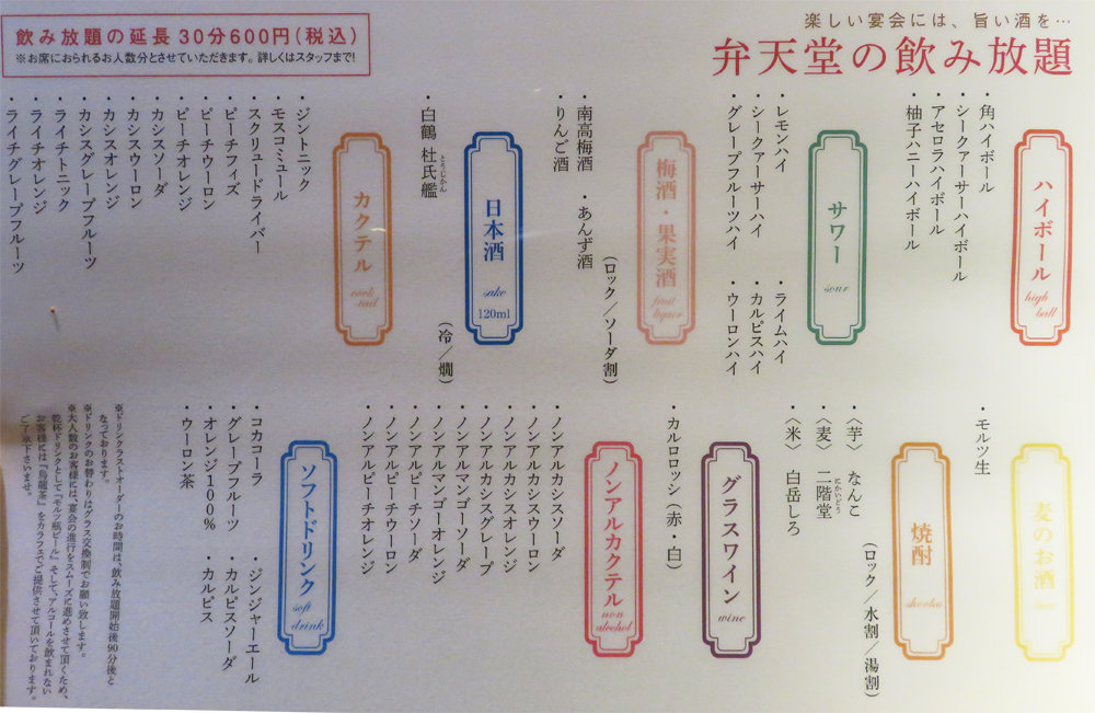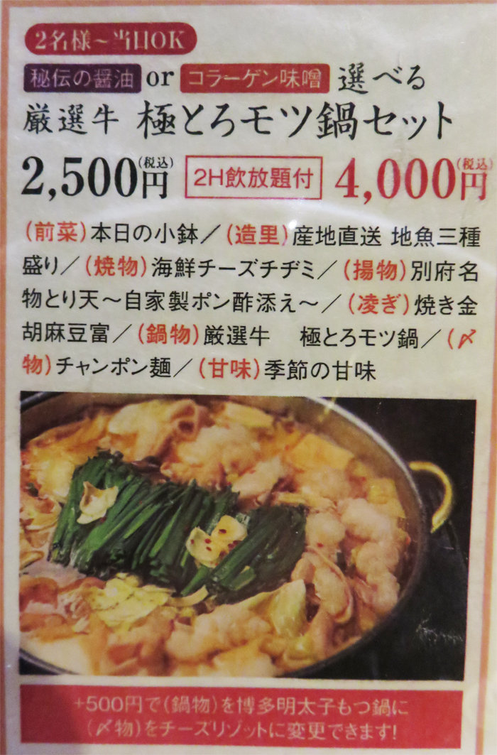 料理が色々あって、2時間飲み放題のコースが付いた4,000円(明太子もつ鍋は+500円)がお得そうなので、