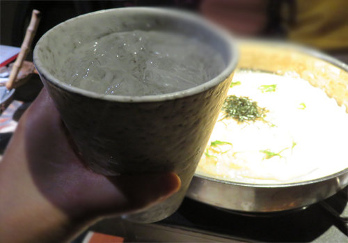 そのままにしておくと、熱で固まってしまいますので、鍋のスープによくブレンドさせておくそうです。