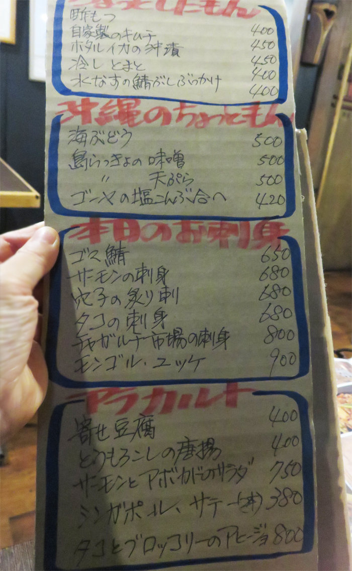 メニューはアジア系の創作料理が多いですが、日替わりでちょっとした沖縄料理や刺身もあります。
