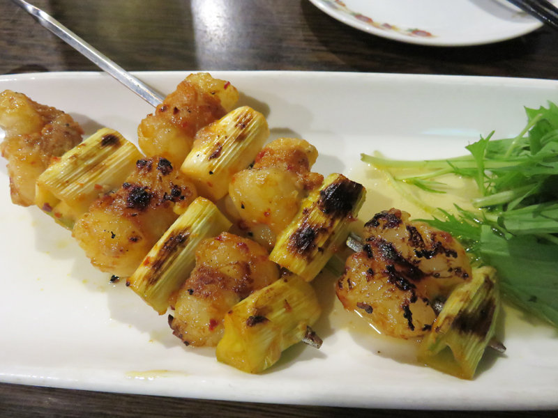 甘辛味噌に漬け込んだ丸腸とネギの串焼きです。