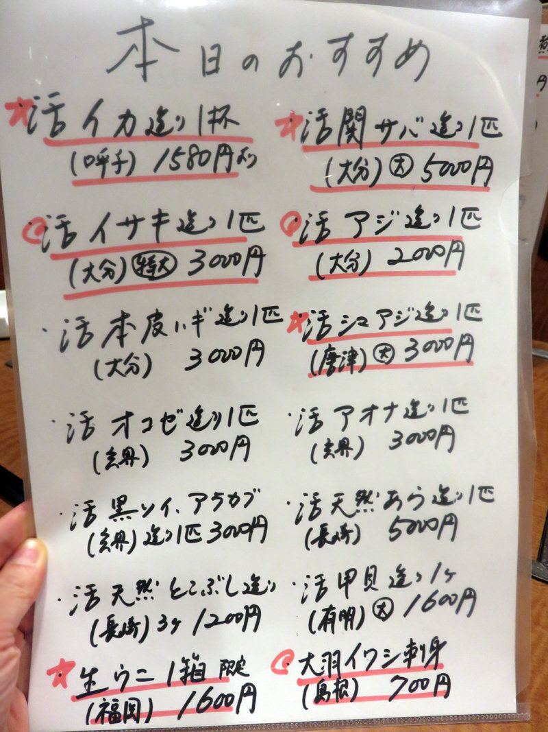 こちらのお店は、生簀の活魚メインなので、刺身の盛り合わせはメニューになく、魚は1尾単位になります。
