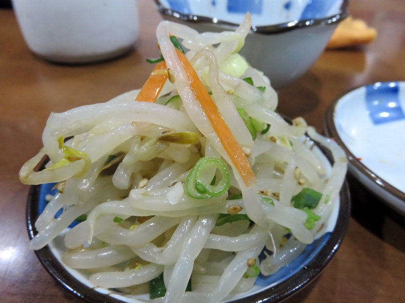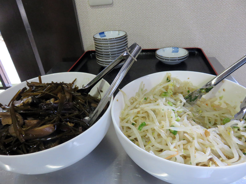 注文して待ってる間に、お惣菜のセルフコーナーの昆布とモヤシをつまみます。