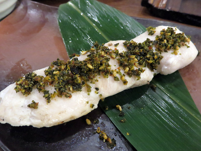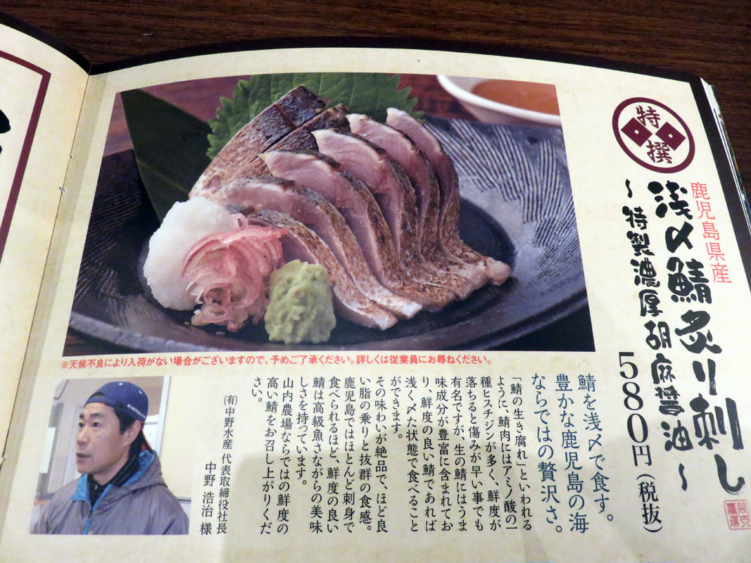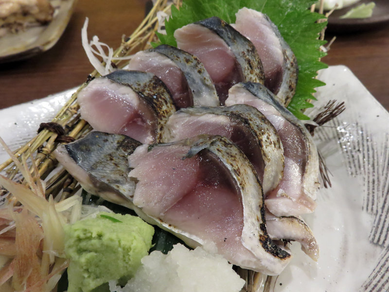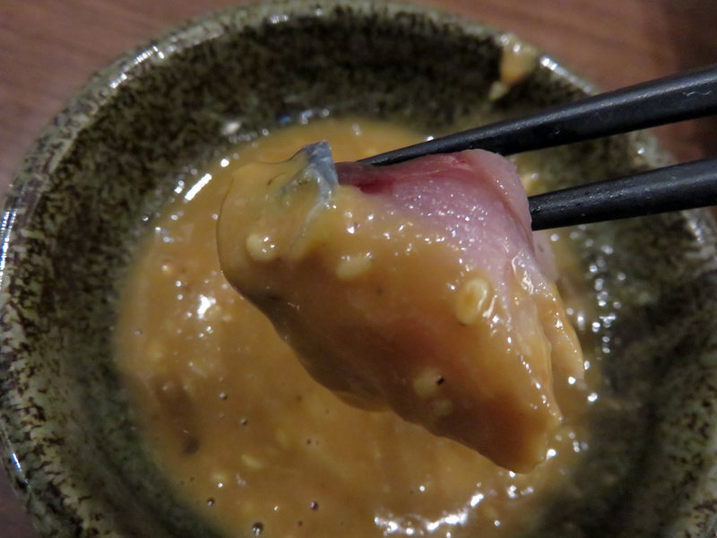 浅〆鯖炙り刺し 特製濃厚胡麻醤油 580円(税抜)。