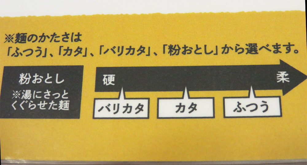 麺の硬さは、普通・カタ・バリカタ・粉おとしから選べます。