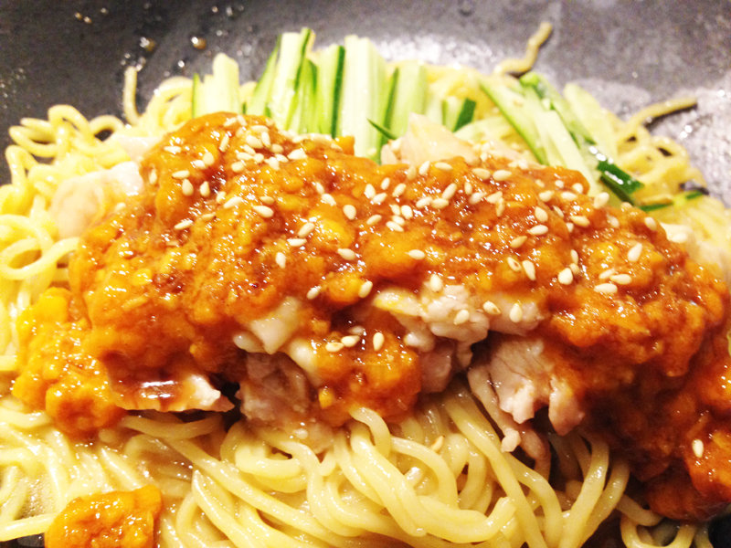 麺の上にポッテポテのピリ辛ゴマソースがかかった棒棒鶏とキュウリがたっぷり。