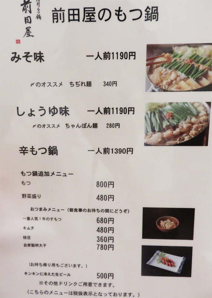 こちらはもつ鍋のメニューです。
