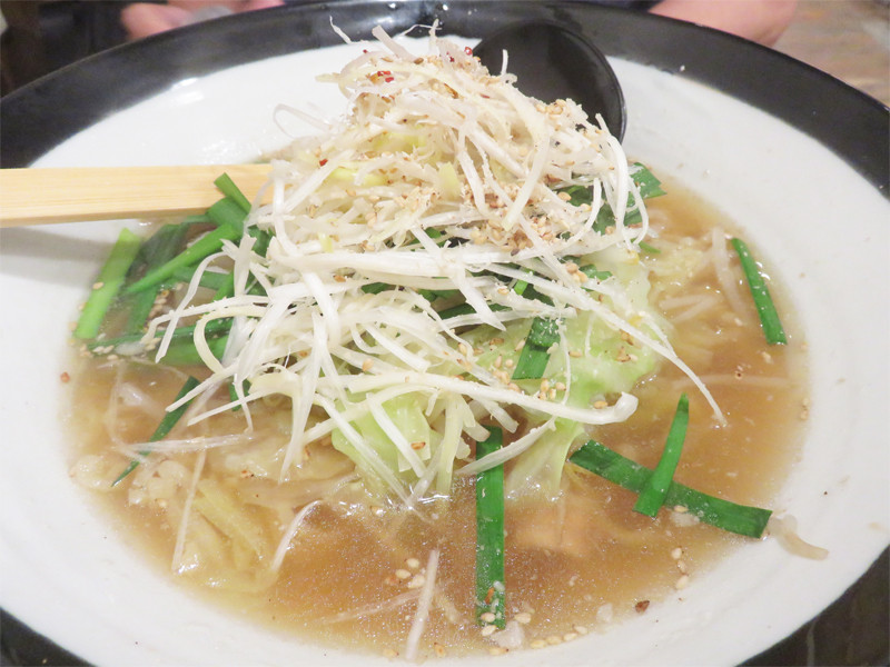 もつ鍋らしい具のキャベツとニラの他に、白髪葱も沢山トッピングされています。