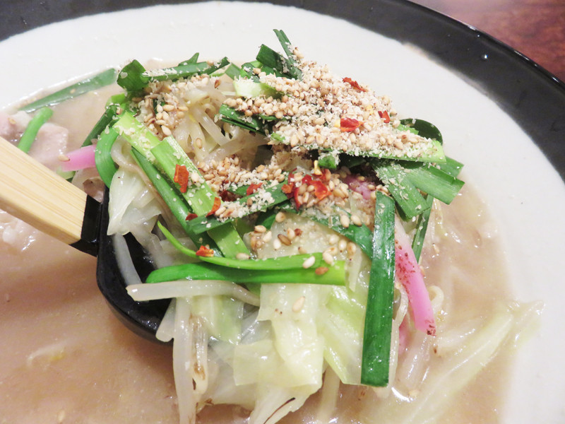 ニラ・ゴマ・唐辛子のトッピングがもつ鍋を連想させます。