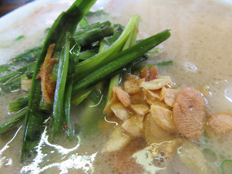 揚げニンニクのトッピングは、熊本ラーメンではポピュラーですが、博多ラーメンには珍しいです。