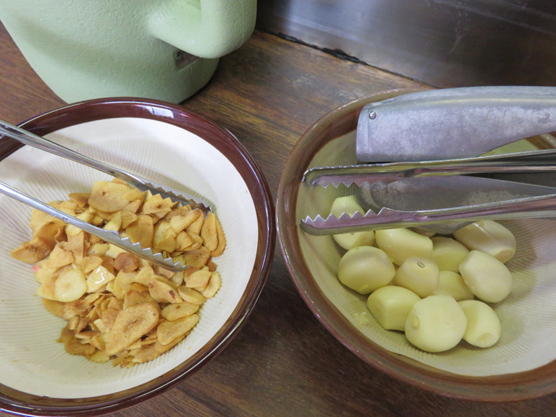 クラッシュタイプの生とスライス状の揚げニンニクです。