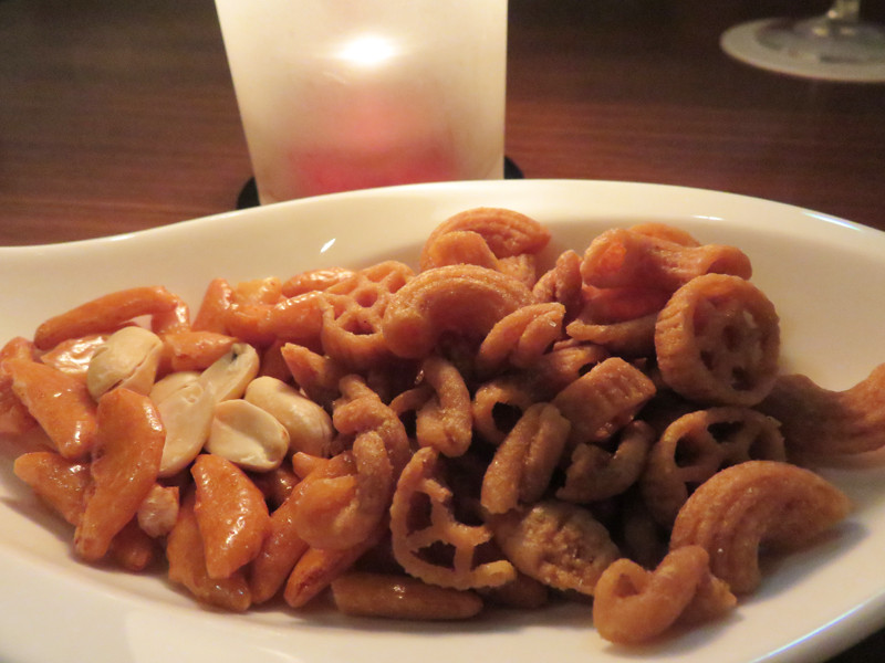 あまり頂いてませんが、お通しは、マカロニのカリカリと柿ピーでした。