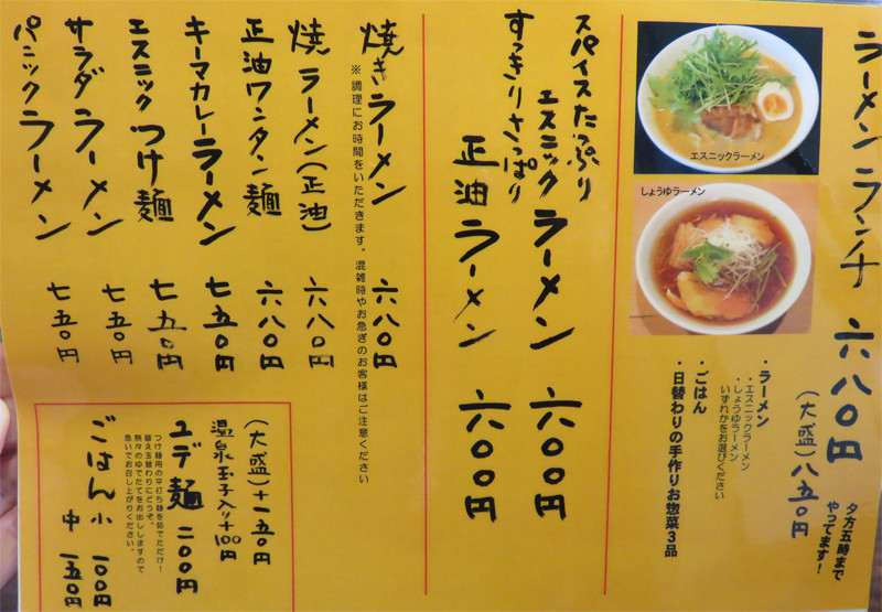 辛いのが苦手な方には、醤油ラーメンや焼きラーメン(エスニック味と醤油味)、