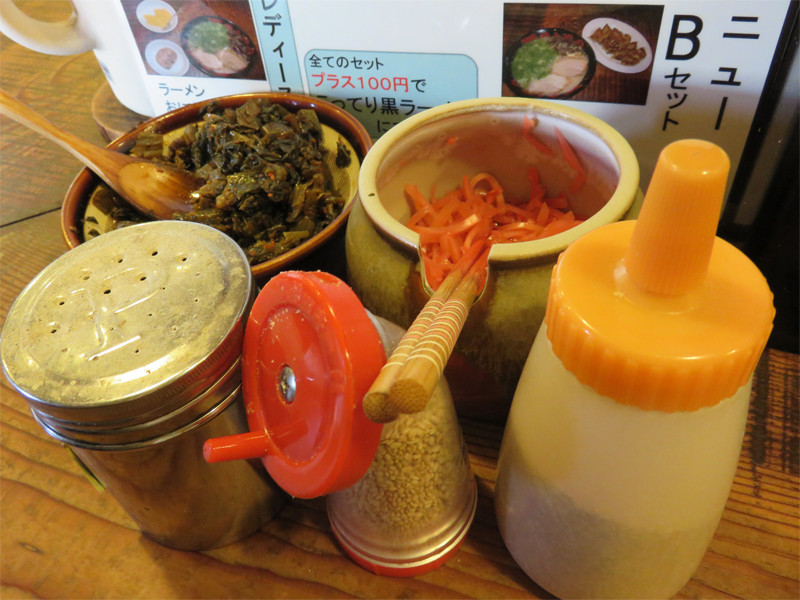 自家製辛子高菜と紅しょうが、スリゴマと粒ゴマ、コショウなど。