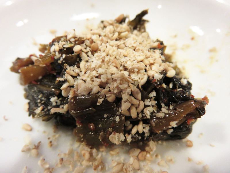 手持ち無沙汰で、卓上の辛子高菜を小皿に取ってつまみます。