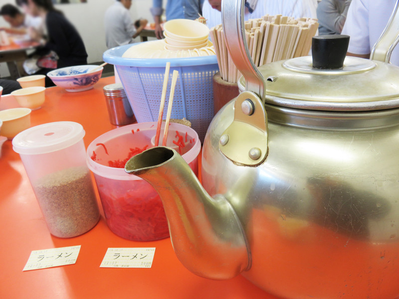 テーブルの中央には、お茶や湯のみ、箸(レンゲはない)、ラーメン用の紅しょうが・ゴマ・コショウ・タレが置いてあります。