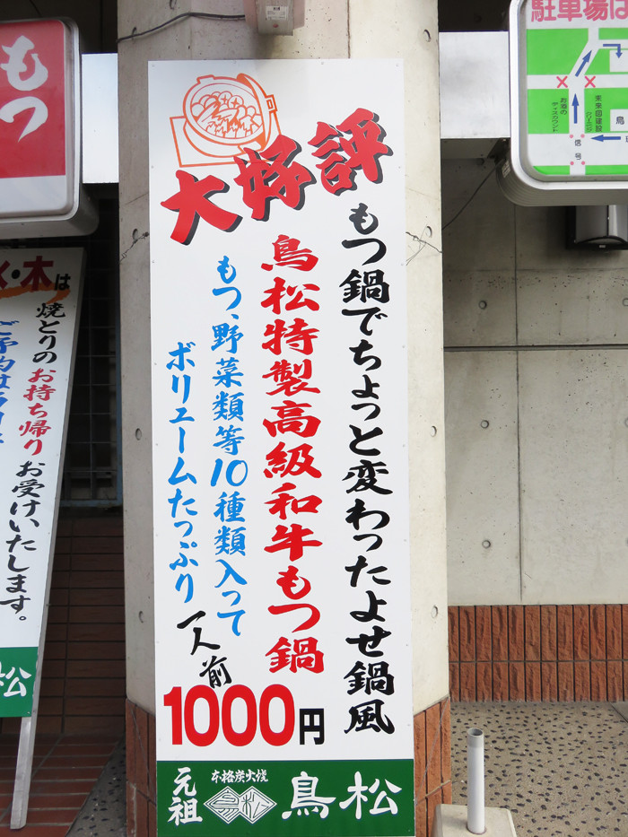 『大ちゃんラーメン』の並びにある『焼鳥 鳥松』のモツ鍋の看板。