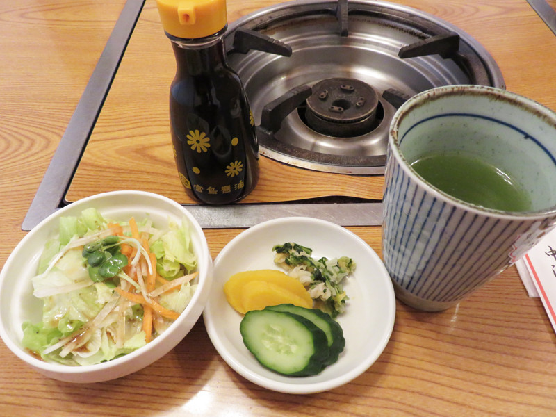 まず、最初に供されたのは、サラダと漬物とお醤油とお茶です。