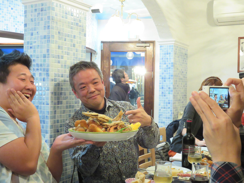 ゼッポリーニ(イタリアの青海苔天)を頬張る私。