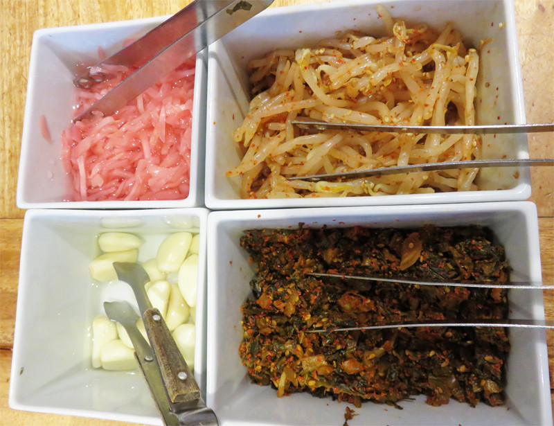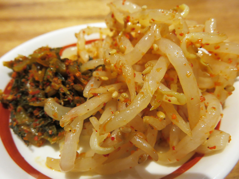 卓上の一風堂オリジナル『ホットもやし』と辛子高菜をつまみながら、待ちます。