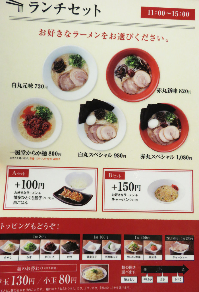 福岡だと、大名店で、元祖白丸元味&元祖赤丸新味・一風堂かさね味が頂けます。