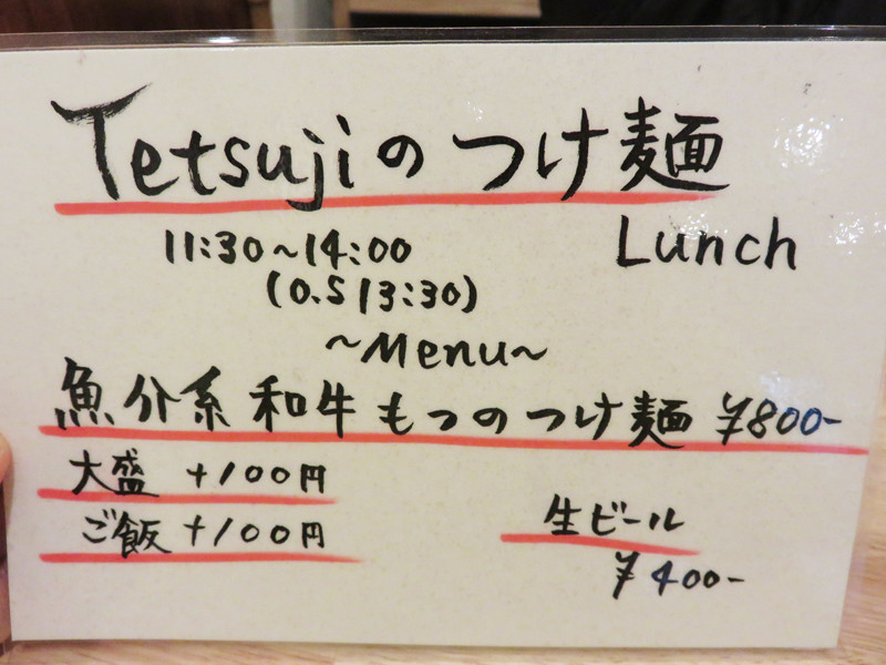 ランチメニューは、魚介系和牛もつ入りのつけ麺のみです。
