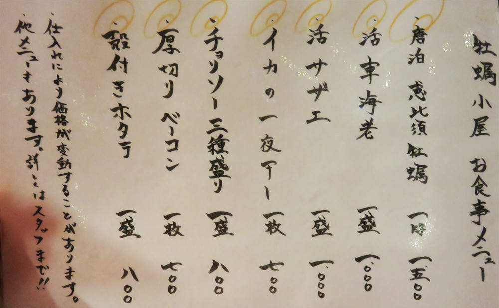 こちらは牡蠣小屋(炭火焼き)のメニューです。