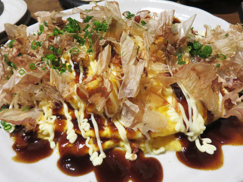豚バラ肉入りの野菜炒めを薄焼き卵でオムレツ状に包み、お好み焼き風に仕上げたもの。