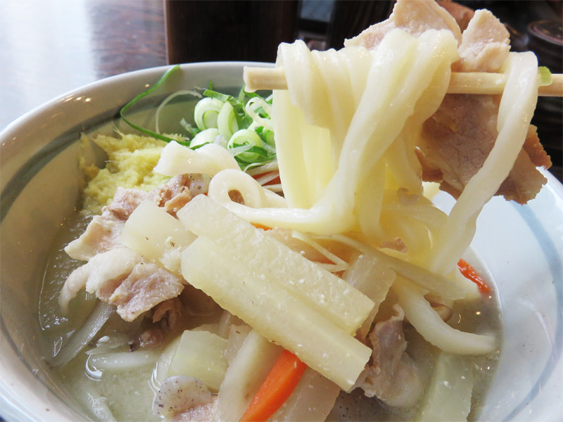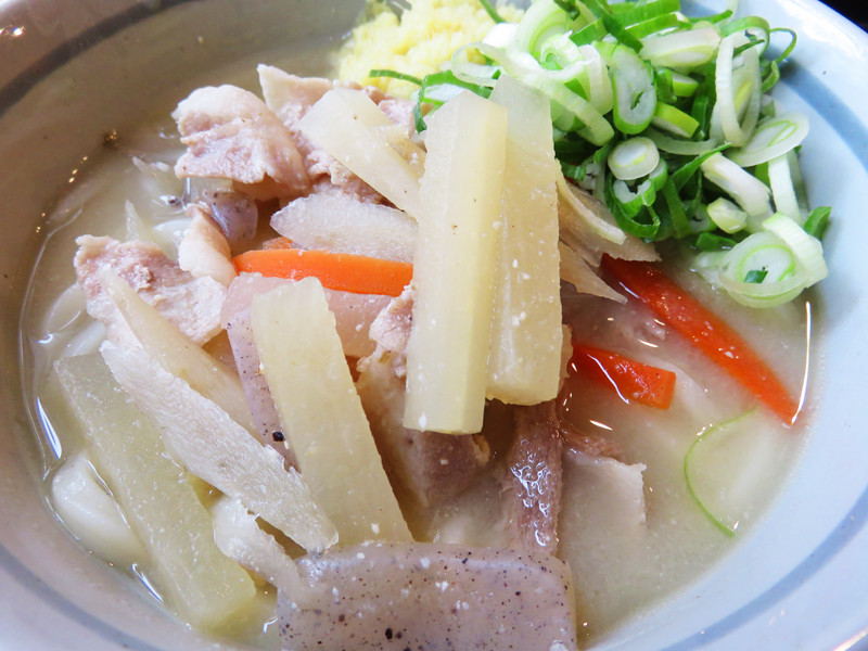 大きめカットの根菜がたっぷり入り、大地の香りがする汁うどんです。