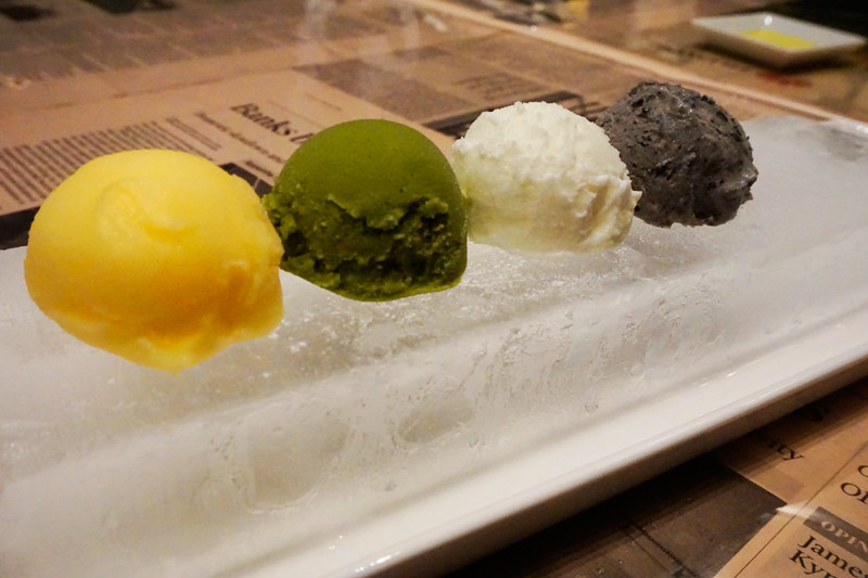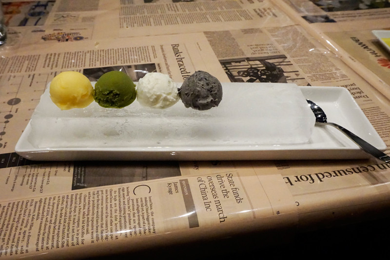 この時のデザートメニューは1種類のみで、アイスクリーム4種の盛り合わせでした。