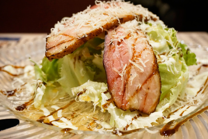 大皿にこんもりと盛られたレタス、の上に自家製の厚切りカットのベーコンがのってます。